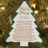 Text on Ornament:  "May God Bless This Family” May God’s blessings cover every part of this family’s life. May His love fill their hearts, His peace calm their minds, and His wisdom guide their decisions. Let their home be a place of grace, where joy, faith, and love flourish. May God’s protection be upon them and His provision meet their every need, and His light lead them on every path. In times of trial, may they find strength in His presence, and in times of joy, may they feel His endless love surrounding them."