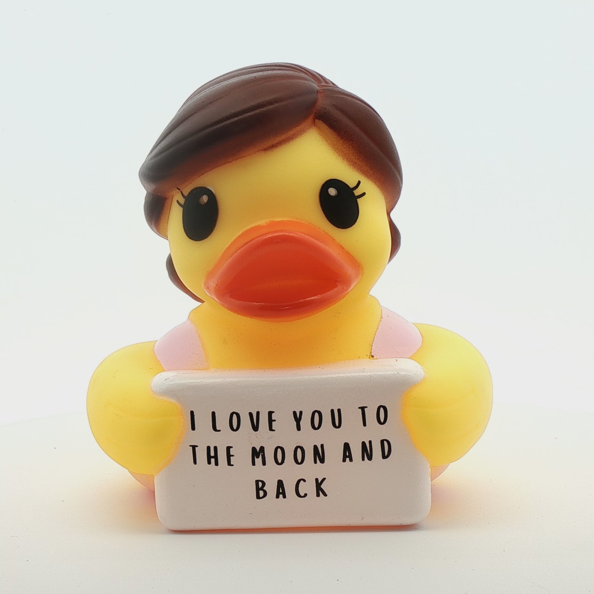 Momsie Duck holds a sign that says “I Love You To The Moon & Back,” a message that goes far beyond words — it’s a love that knows no distance, no end, no limits. It’s the kind of love that travels with you, even when you’re apart. A reminder that someone, somewhere, is thinking of you and sending warmth your way. It means my love reaches farther than the moon and always finds its way back to you.