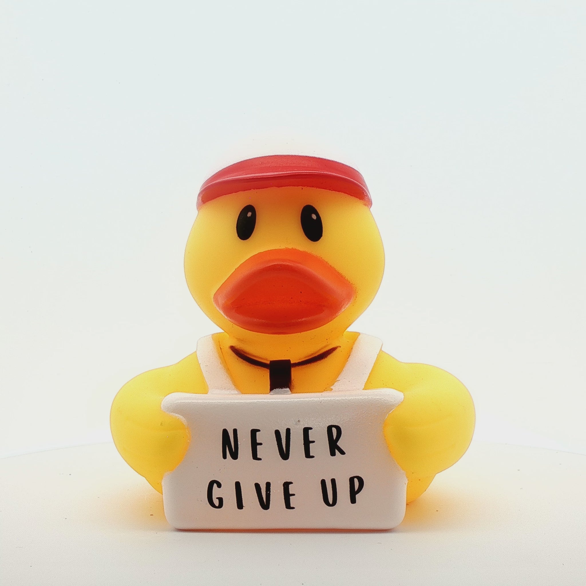 Coach Quack displays a sign that reads “Never Give Up,” He is is all about courage under pressure. It’s a steadfast reminder that the road may be long, but your strength is longer. When life gets tough, let this little feathered friend remind you that perseverance always wins.