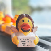 Jesus Duck Holds a sign that reads “WITH GOD ALL THINGS ARE POSSIBLE – Matt. 19:26,” this stands as a symbol of faith, courage, and limitless potential. A beautiful reminder that obstacles are just opportunities for God to do a miracle — and that when you walk in faith, impossibility becomes possibility.